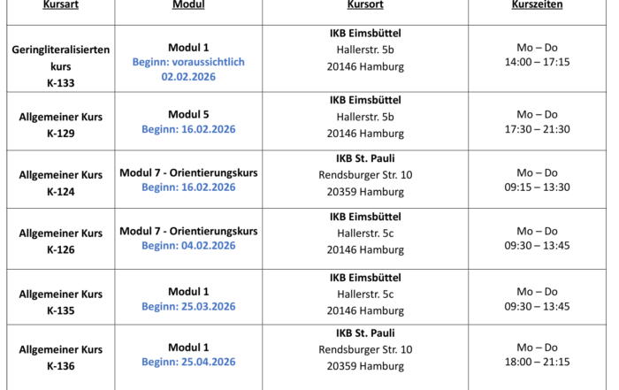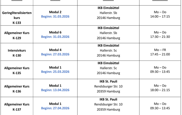 Die Interkulturelle Begegnungsstätte bietet in den Stadtteilen Eimsbüttel und St. Pauli Integrationskurse an. Diese werden vom Bundesamt für Migration und Flüchtlinge (BAMF) gefördert. Die Kurse finden vormittags oder abends von Montag bis Donnerstag statt. Vereinbaren Sie einen Termin in der Lernberatung.